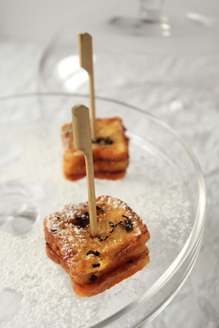 Ce premier week-end de janvier était une occasion toute trouvée pour concocter un petit goûter. Le thé, le lait, le pain... Le pain perdu s'est imposé comme une évidence. Pour lui donner un parfum différent, je lui ai ajouté de l'earl grey infusé dans le lait puis j'en ai parsemé au moment de la cuisson pour intensifier le goût.